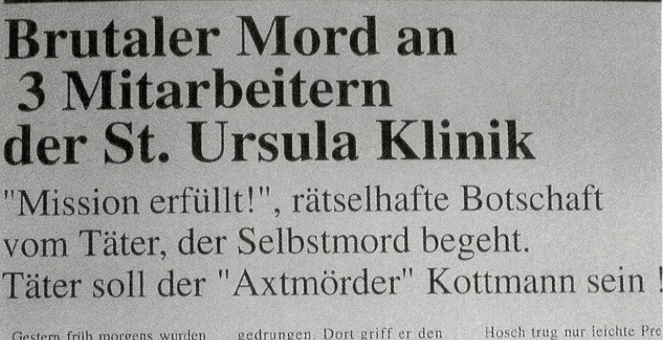 The Introduction begins with recounting the events that took place one night in a hospital in Salzburg. Gustav Kottmann, a serial killer wanted for the murder of seven men and women, suddenly showed up at St. Ursula Emergency Clinic and, wielding an axe, went on a rampage, killing two nurses and a doctor. Then, after proclaiming that his "mission" had been accomplished, he committed suicide with the axe.