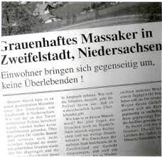 The final piece of Johan's journey for Weber to uncover are the events of Ruhenheim and the massacre that took place there. Strangely, this brought to mind a another case from 1958. The town of Zweifelstadt met a similar fate with all the inhabitants slaughtering each other. The event began with a simple murder case relating to a gang dispute. The police were slow to reveal the details of the death and rumor quickly overcame the town. Person to person, this rumor grew of psycho criminal hiding amongst the villagers. Quickly public opinion turned on Michael Oswalt, a townsfolk who kept a hunting rifle on clear display in his home. The first murder occurred when Oswalt's neighbor shot another resident mistaking them for Oswalt. This gunshot was heard by the entire town. Things quickly escalated in the town and people began to shoot anyone who happened to come their way in supposed self-defense. The village was annihilated in a single night.