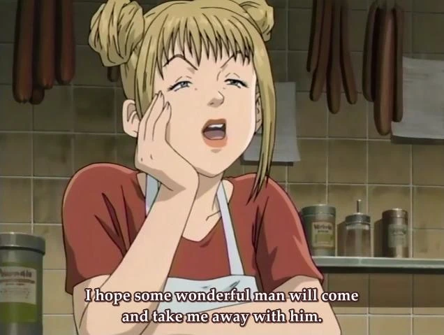 After some time she escapes the hotel and finds Heinrich Runge and Tenma. Tenma orders her to stay in place while he's taking a man and his baby to a safer location, but when she sees Grimmer again, she runs to him and gets shot, causing Grimmer to kill the attackers in a fit of rage.