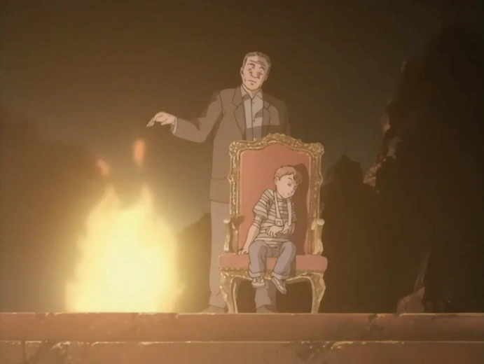 Tenma comes back to the Kinderheim 511 building and finds Dieter sitting on a chair next to a bonfire. Hartmann then arrives and tells Tenma that all the instructors and children of Kinderheim 511 died, and that Johan watched it all. Hartmann reveals that it was Johan who caused the fire at Kinderheim 511.