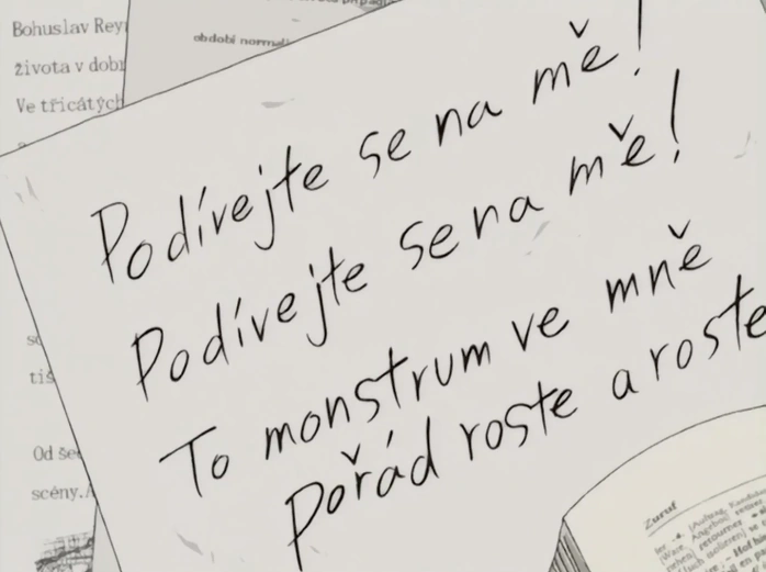 Lunge goes to a karaoke bar with the Japanese men and misses the meeting with his daughter. One of the Japanese men, Yamamoto, brings a copy of Obluda that Johan requested. Lunge takes a look at the picture book and translate a passage of it: "Look at me! Look at me! The monster inside of me has grown this big!".