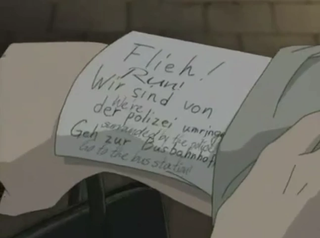 Dr. Gillen had let the authorities know of their meeting. He requested of them to let him use Dr. Tenma as research subject should they succeed on arresting him. They met in front of the fountain in Oder Park. He said that after analyzing his report on Johan, he had confirmed his existence. He also mentioned his cheating in college out of blue, which confused Dr. Tenma. Then, Gielen let out an arm with a cheat sheet again, but this time, it contained instructions for Dr. Tenma's escape. Dr. Gillen confessed that he led the authorities near him, but that he now knew that Tenma was innocent after he paid a visit to Mrs. Kemp's basement. They mingled with the noisy crowd to facilitate Dr. Tenma's flight. After blending into the group, Dr. Gielen explained why he now believed his former classmate. He showed him Frau Kemp's altered picture with the boy, then added that she did not have any children. Johan was using Frau Kemp's kindness for his own sustenance and then eliminated her when she was no longer useful. Dr. Gillen believed in Dr. Tenma's innocence.